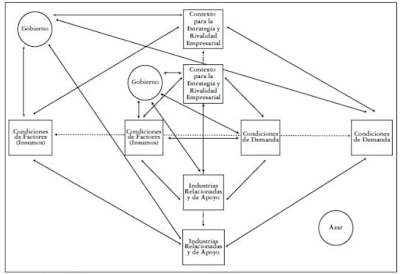 El diamante de Porter es un modelo desarrollado por Michael Porter que explica por qué algunas industrias o países son más competitivos que otros. Este modelo identifica cuatro factores clave que influyen en la competitividad de una industria o país: factores relacionados con el recurso, el factor de apoyo, la estructura de la industria y la estrategia y la estructura de la empresa. (Ariza, Y; 2012)